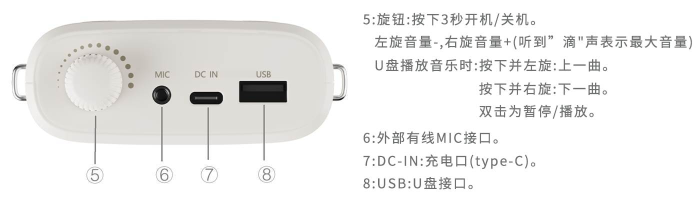1. 开机:长按旋钮3秒,扩音器提示“开机”。开机后单击为蓝牙,再单击为扩音器模式。