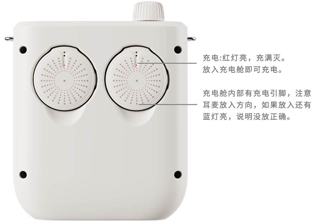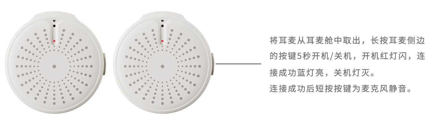 2. 连接无线耳麦:将耳麦从耳麦舱中取出,长按耳麦侧边的按键5秒开机/关机,链接扩音器后耳麦按键短按为静音。